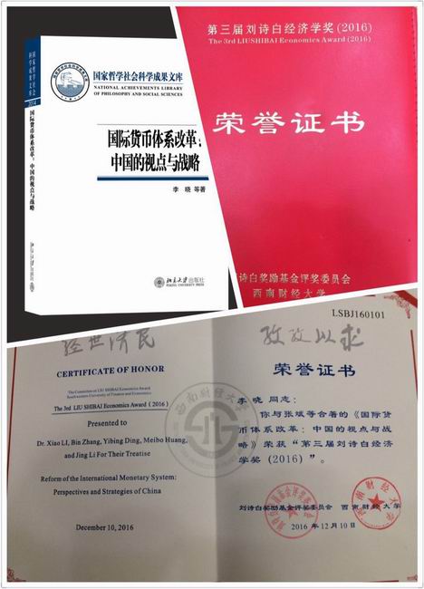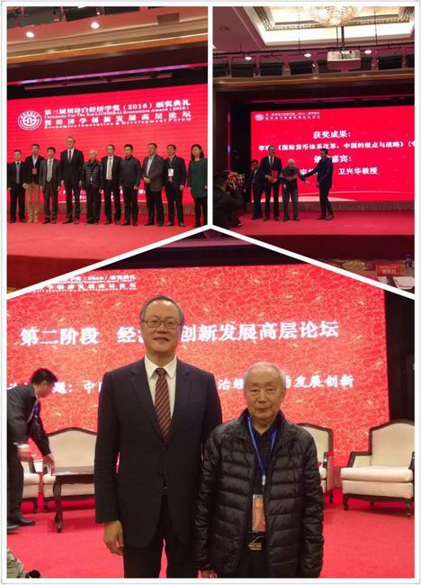 2016年12月10日,第三届“刘诗白经济学奖”颁奖典礼暨经济学创新发展高层论坛在北京隆重举行。本届“刘诗白经济学奖”共评选产生10项获奖成果,我校德赢vwin官方入口李晓教授的《国际货币体系改革:中国的视点与战略》荣获学术专著奖,这是我校首次获得刘诗白经济学奖。