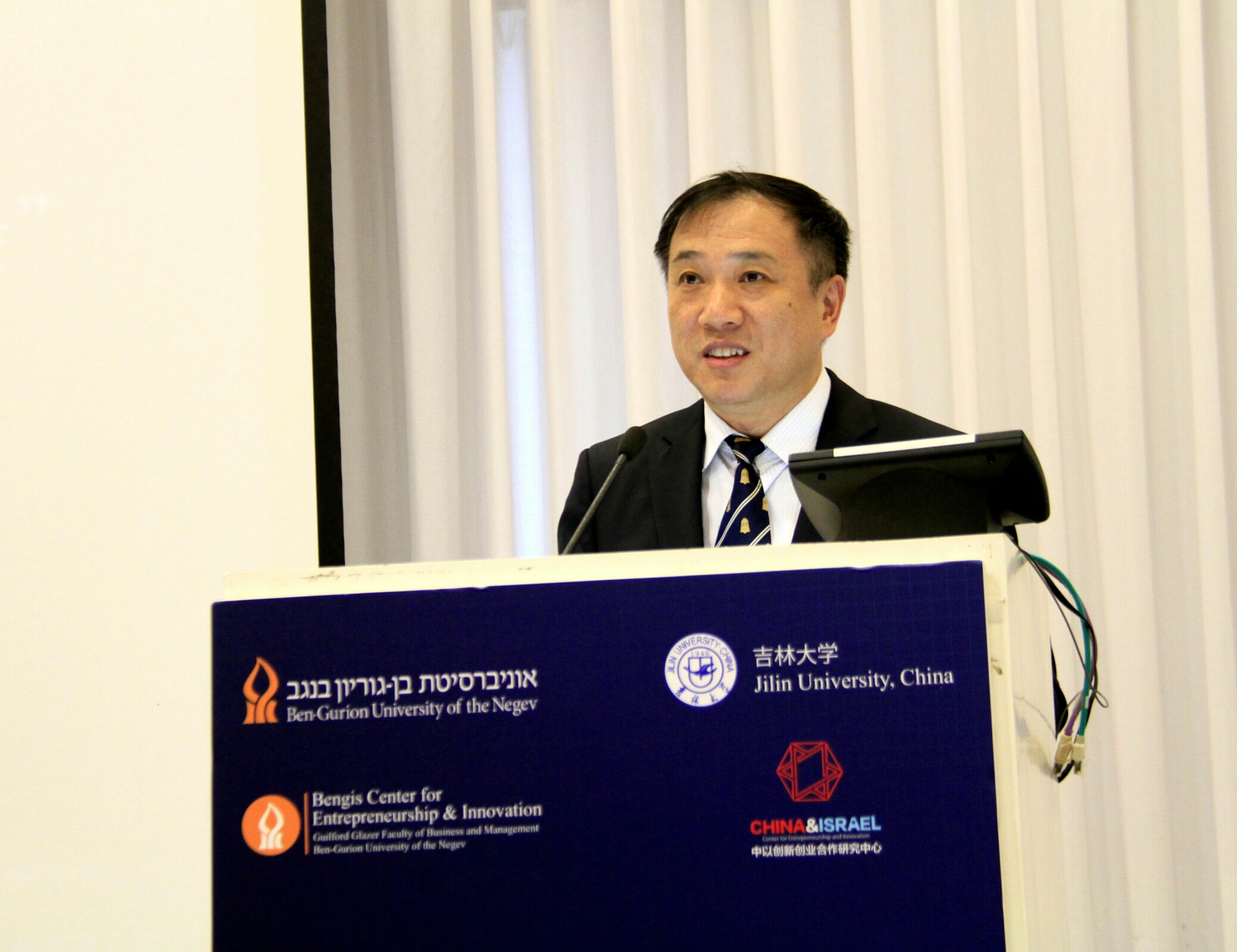 在会议联合主席、Bengis创新创业中心主任代芙娜教授主持下,德赢AC米兰官网校党委书记杨振斌教授、以色列本·古里安大学校长丽芙卡·卡米尔教授、共青团吉林省委书记程龙博士、中国驻以色列大使馆教育处姜延东一秘、以色列外交部代表潘立文等分别在开幕式上致辞。