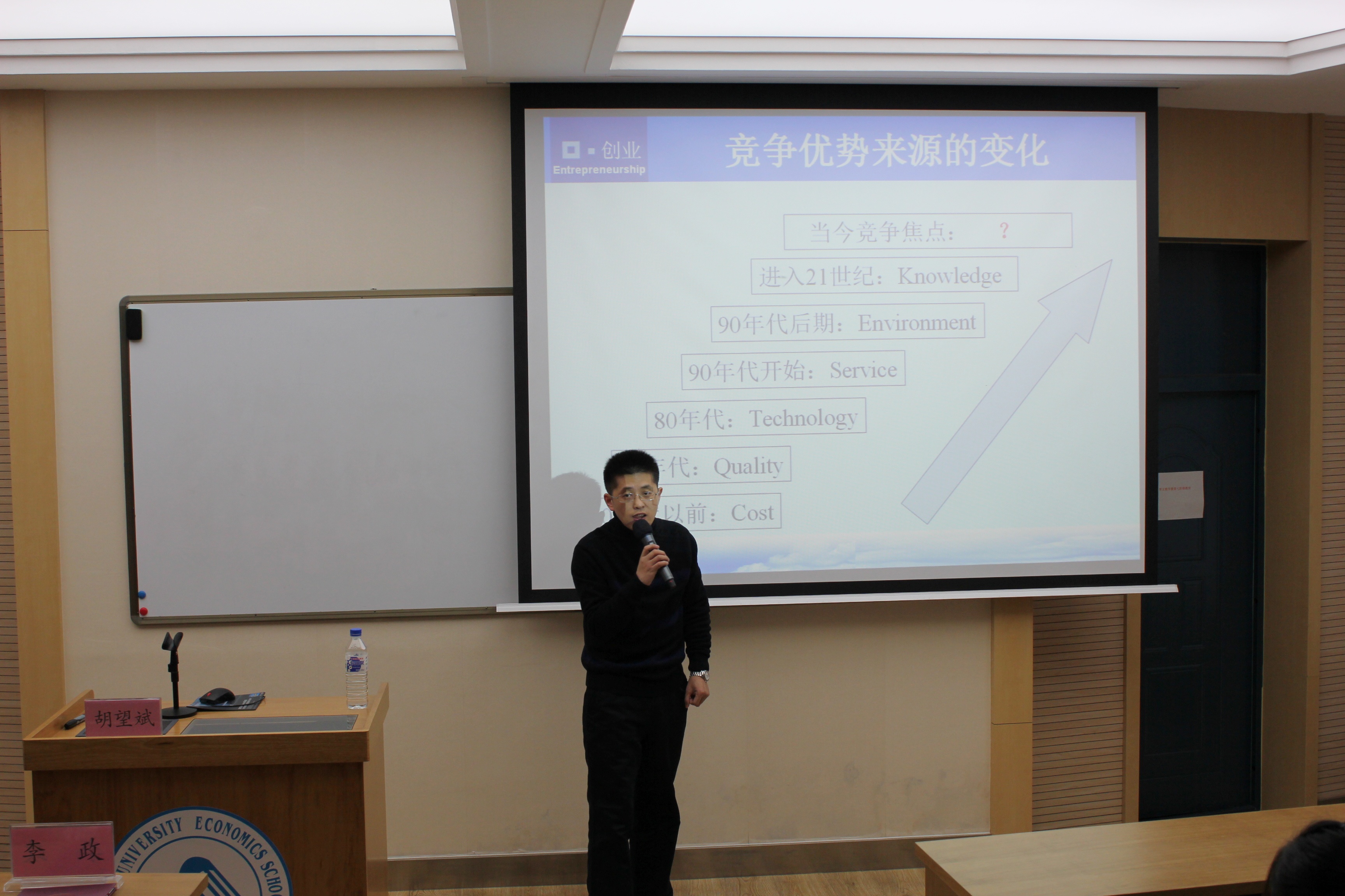 随后,胡望斌副教授为我们做了题为“认识创业及其本质”的演讲。他主要介绍了创业实践与研究热潮。他根据竞争优势来源的变化推断出创业将逐渐成为主流趋势。创业能解决中国许多现实问题,促进中国经济不断发展。接着,胡教授介绍了创业本质和创业创新的关系。最后,他介绍了创业过程与要素。