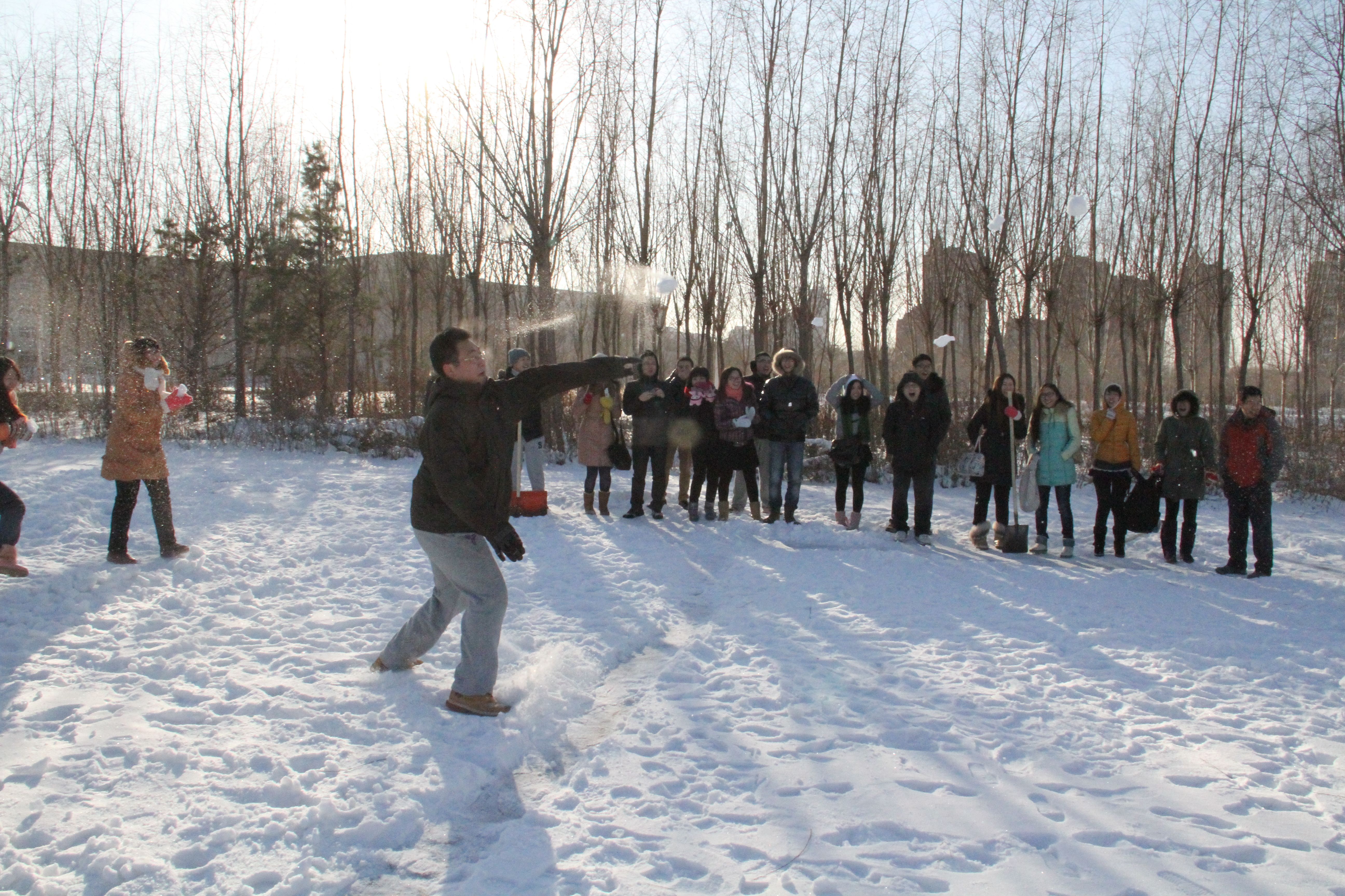 在田径场上驰骋比拼,在球场上激情对抗可能在大学校园里都不足为奇,可能要是以正规的赛制模式去进行一场打雪仗比赛想必同学们都很少经历到。本次比赛采用车轮战赛制,学生代表队与老师代表队对战,各系代表队再分别交叉对战,以净胜场次最多组为胜者。在裁判员史记同学介绍比赛规则后,比赛正式开始,平时温文尔雅的同学在赛场上完全换了一副模样,淑女变成了“女汉子”,比起赛来不输男生,老师的表现也一改平时在办公室的严肃形象,打起雪仗也是有板有眼,比赛过程精彩激烈,趣味十足。
