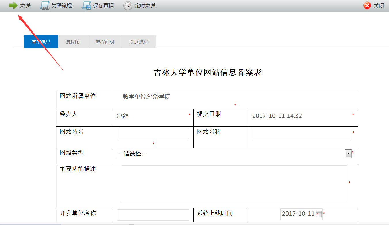 根据学校加强信息系统和网站安全工作的安排和要求,将对与我校教学、科研、管理和服务等业务相关的各级各类信息系统和网站进行备案,请德赢官网各网站负责人根据通知要求于10月13日之前网上进行备案(具体要求参见大数据和网络管理中心2017年9月22日发布的《关于加强我校信息系统和网站安全工作的通知(一)》,2017年10月9日发布的《关于加强我校信息系统和网站安全工作的通知(二)》)。注:请填报人登陆校内办公系统进行填报备案,单位负责人为秦川副院长,发送即可(具体步骤详见照片)。