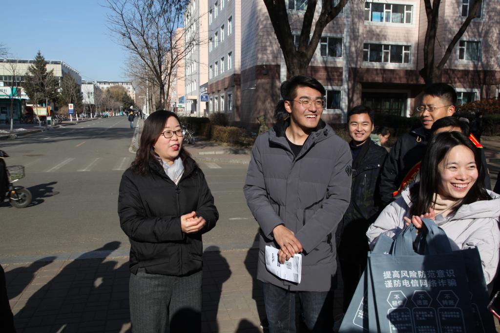如今电信诈骗猖獗,提高同学们的风险防范意识尤为重要。活动现场摆放预防电信诈骗活动展板,双方党支部成员同校园内的同学进行交流,向其宣传防范电信诈骗的知识,并组队发放印有防诈骗图案的购物袋。