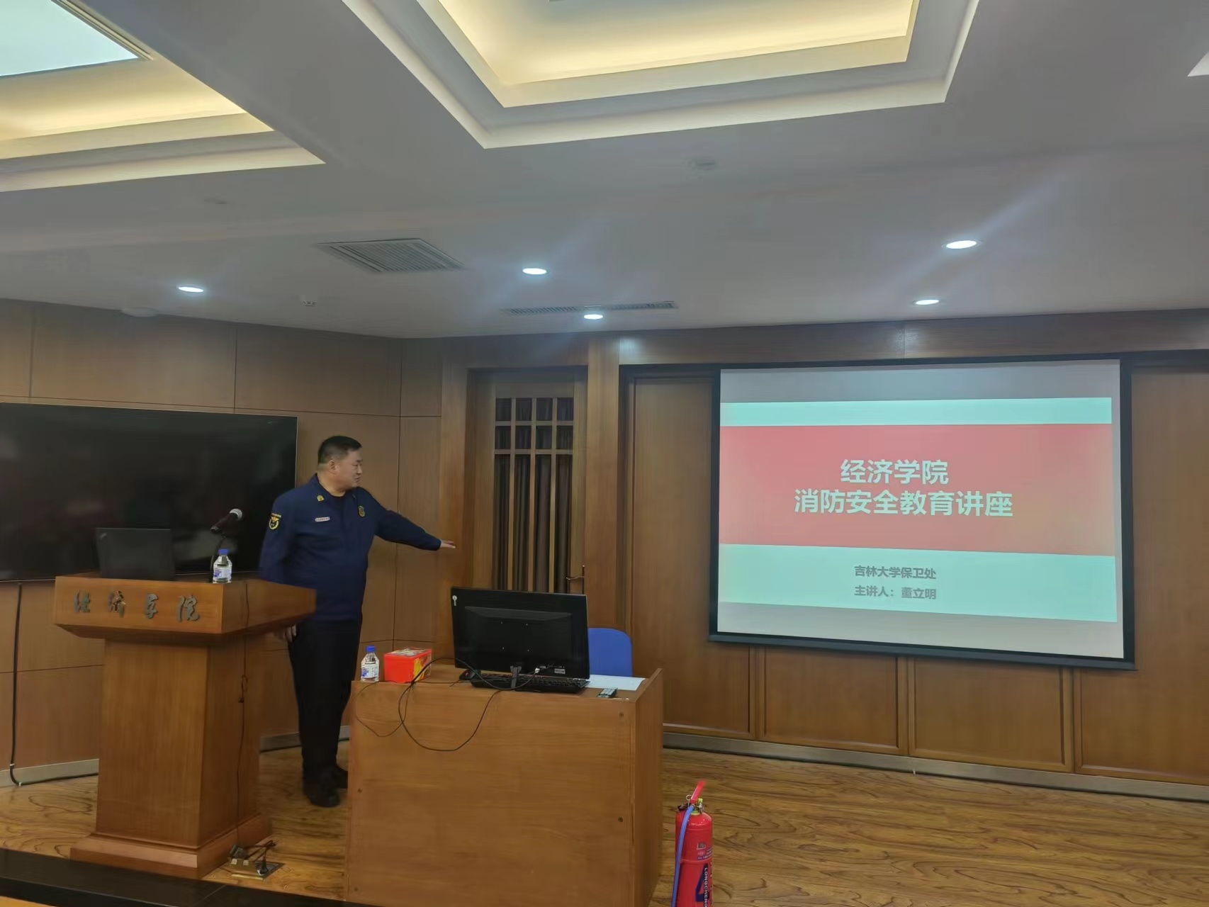 保卫处消防科董立明老师从完善消防安全制度,日常消防安全检查,火灾事故案例等多视角详细讲解在面对火灾时如何正确逃生及使用消防灭火器材等相关知识。