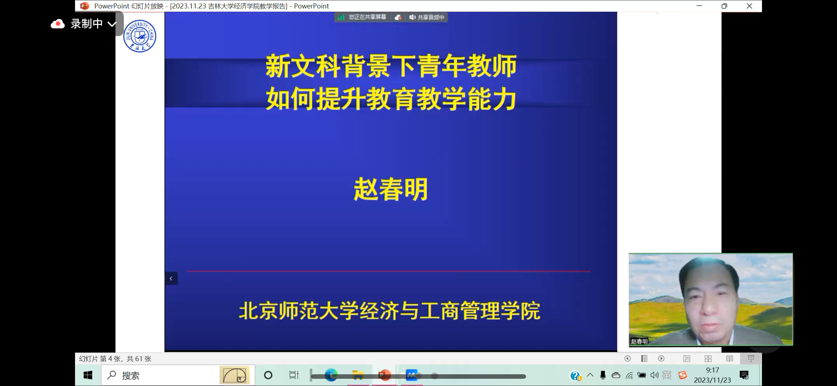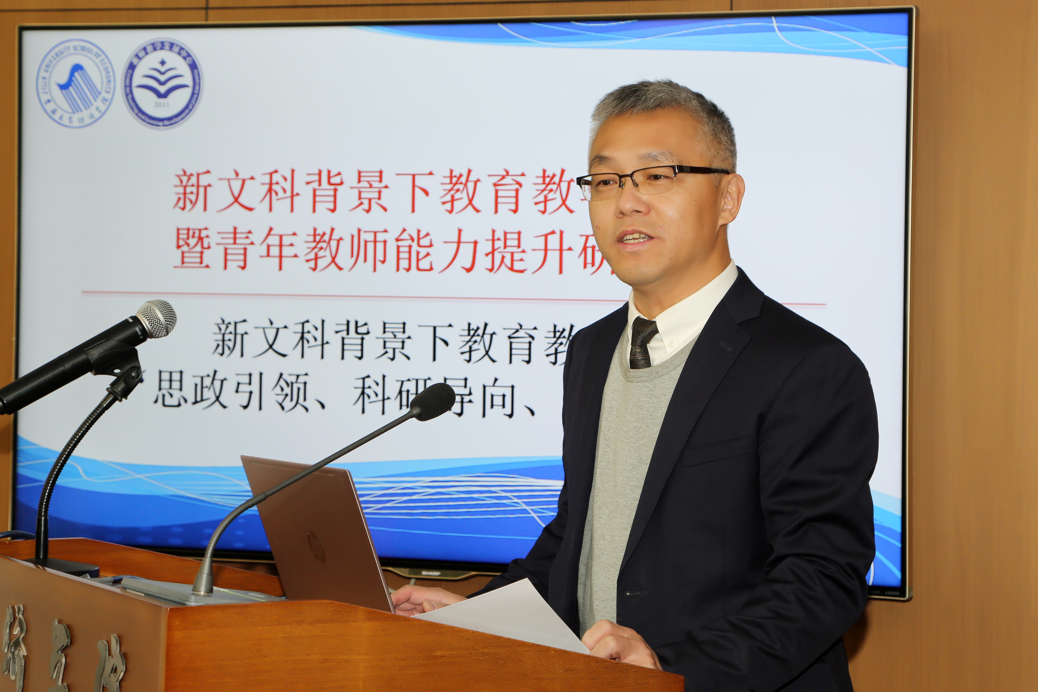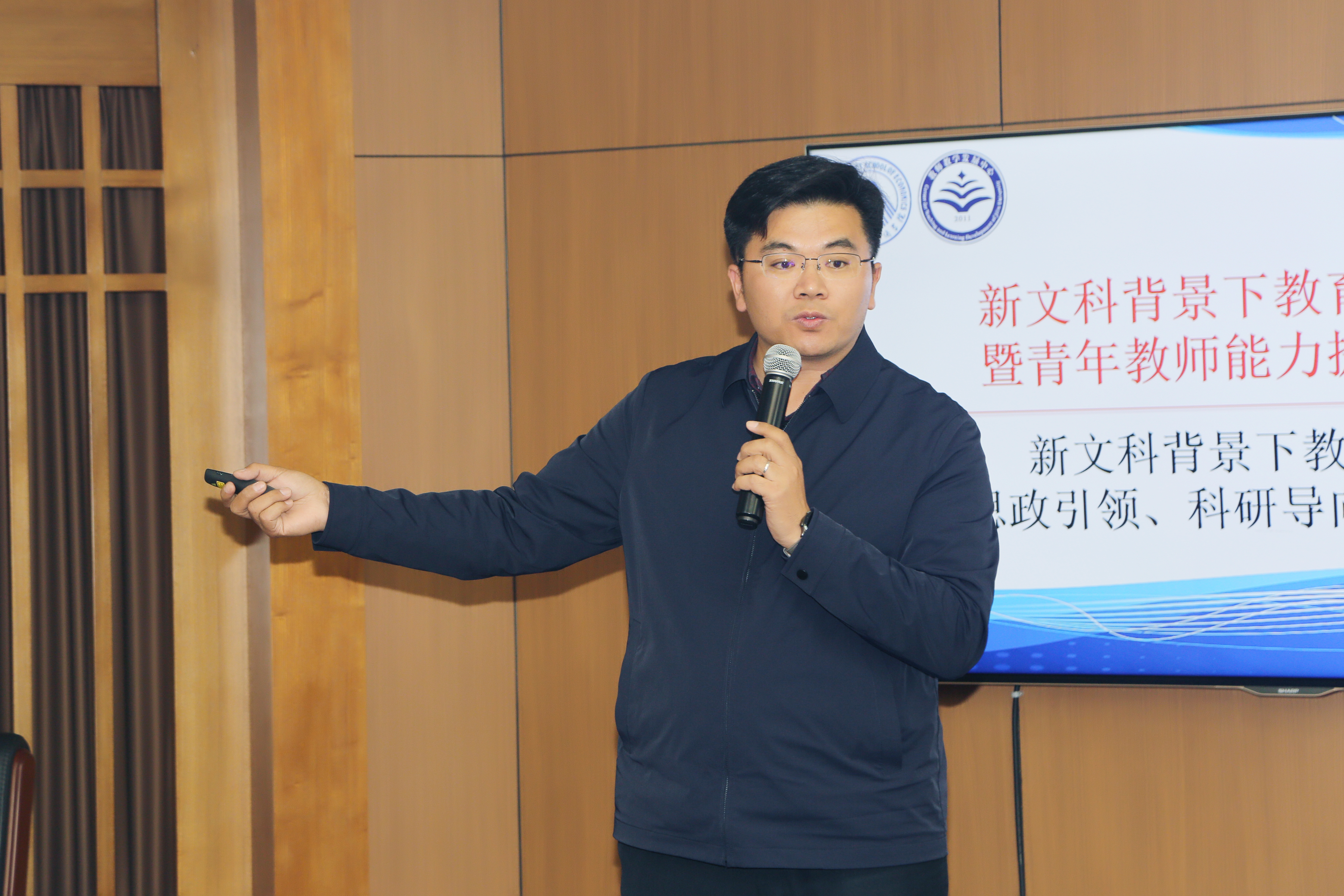 赵春明教授以“新文科背景下青年教师如何提升教育教学能力”为题,结合自身的从教经历,分享了作为高校教师应该如何争做“有理想信念、有道德情操、有扎实学识、有仁爱之心”的“四有好老师”。他总结自己30年执教生涯的最大收获:用心教学,注重把正确的价值观、内心的激情、对学生的关爱和人生体悟渗透到专业知识的讲授中,形成潜移默化的良好影响。