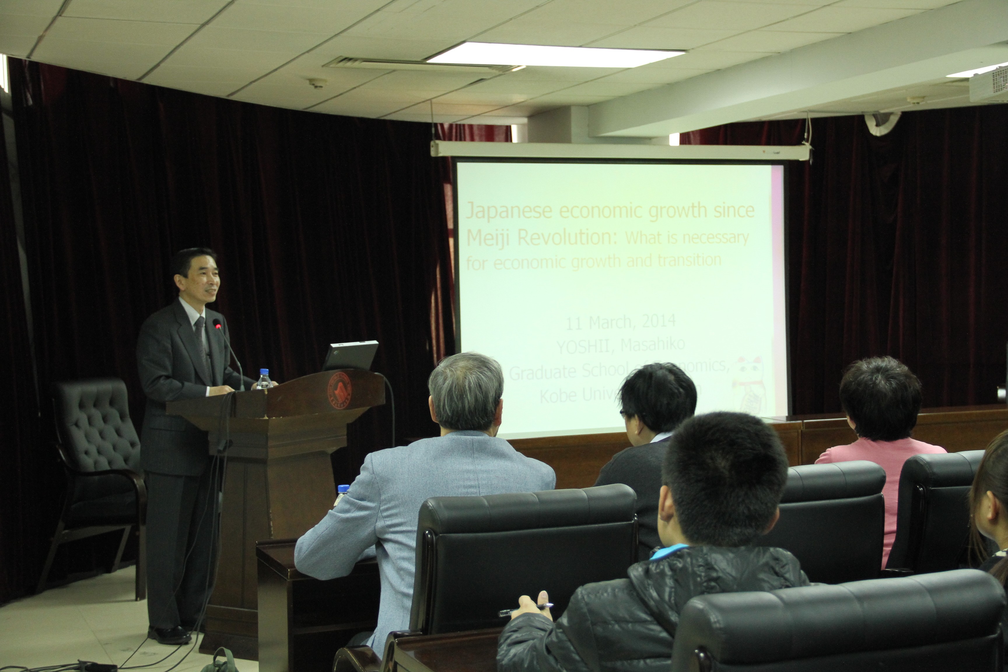 签约仪式结束后,吉井昌彦教授以“日本经济失去的二十年”为题进行演讲。他向我们介绍了日本的人口和城市特征,通过1990-2013年的日本GDP曲线来展现日本的经济情况并根据这些特征分析日本经济衰退的产生原因,并对重构日本经济发表了自己独到的讲解。