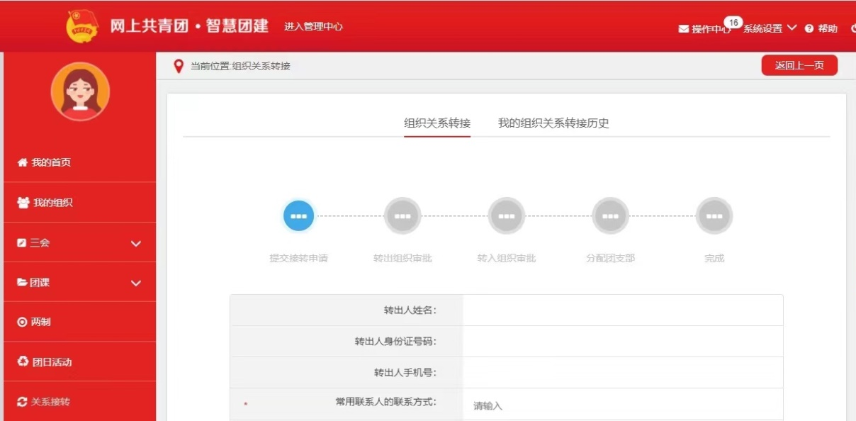 3.进入后,信息根据个人情况进行填写,其中注意【转入组织】一项,具体选择如下图所示: