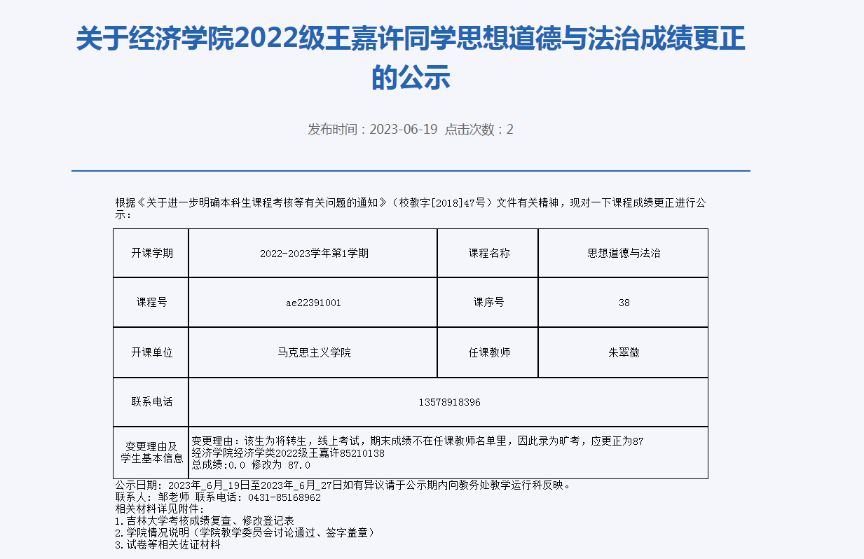 关于德赢vwin官方入口2022级王嘉许同学思想道德与法治成绩更正的公示