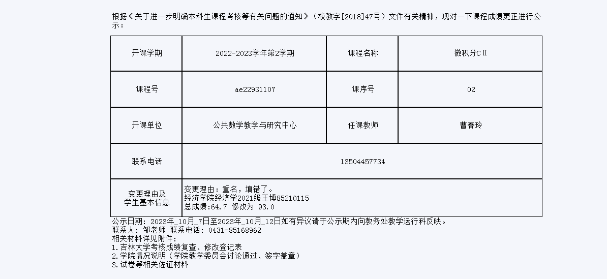 关于德赢vwin官方入口2021级王博同学微积分CⅡ课程成绩更正的公示