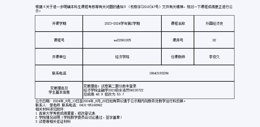 关于德赢vwin官方入口2023级余浩然同学外国经济史课程成绩更正的公示
