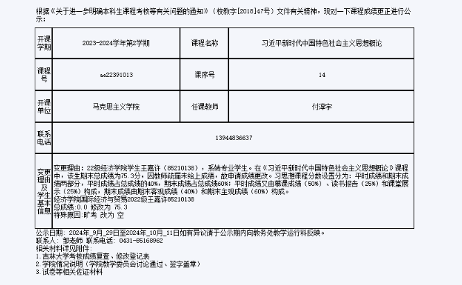 关于德赢vwin官方入口2022级王嘉许同学习近平新时代中国特色社会主义思想概论课程成绩更正的公示