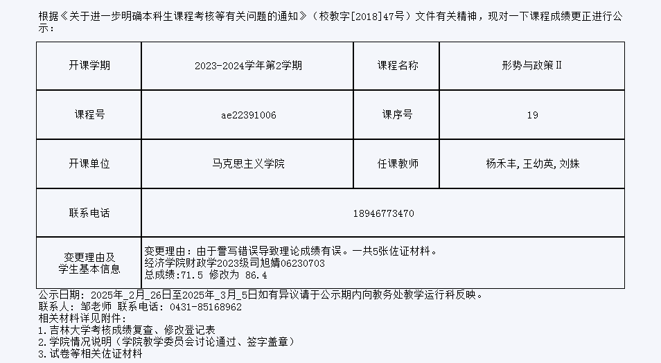 关于德赢vwin官方入口2023级司旭婧同学形势与政策Ⅱ课程成绩更正的公示