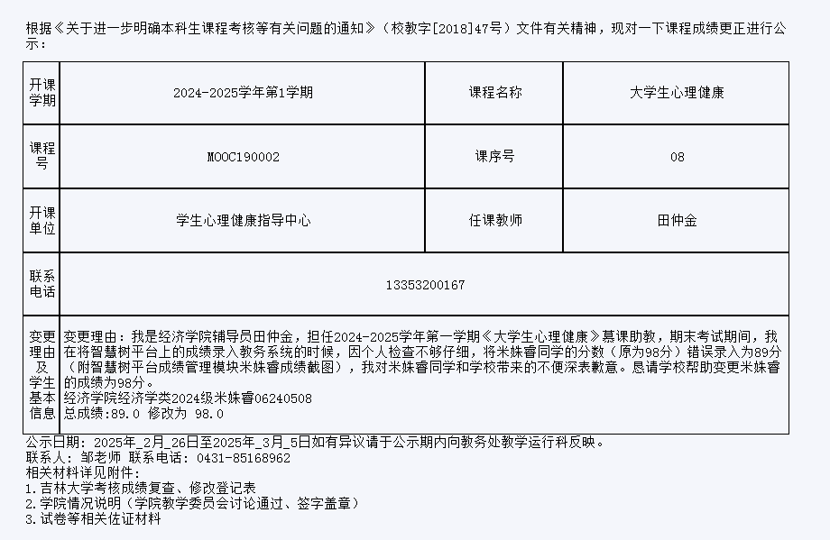 关于德赢vwin官方入口2024级米姝睿同学大学生心理健康课程成绩更正的公示