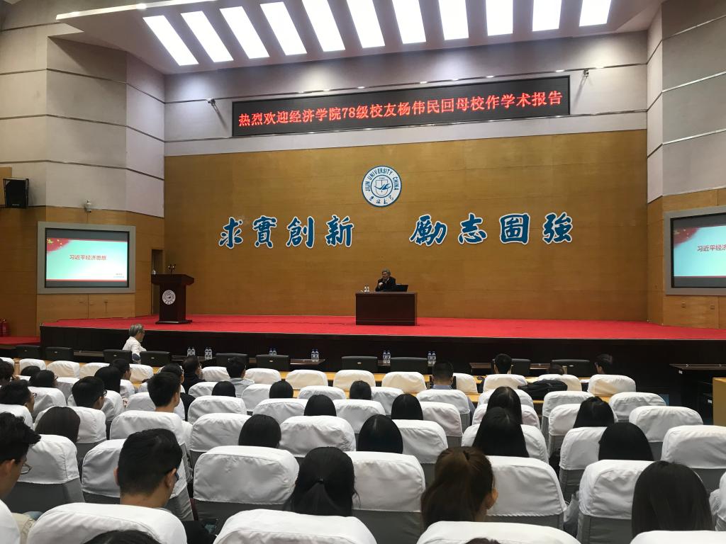 9月7日下午,德赢官网杰出校友、全国政协经济委员会副主任杨伟民受邀回母校作学术报告,报告会在中心校区东荣报告厅举办。此次报告会由德赢vwin官方入口院长李晓教授主持,德赢vwin官方入口副院长史本叶教授出席此次报告会,德赢vwin官方入口经济系李政教授、孙哲博士、范欣博士以及金融系王皓博士等教师和德赢vwin官方入口400余名本科生、研究生参加了此次报告会。
