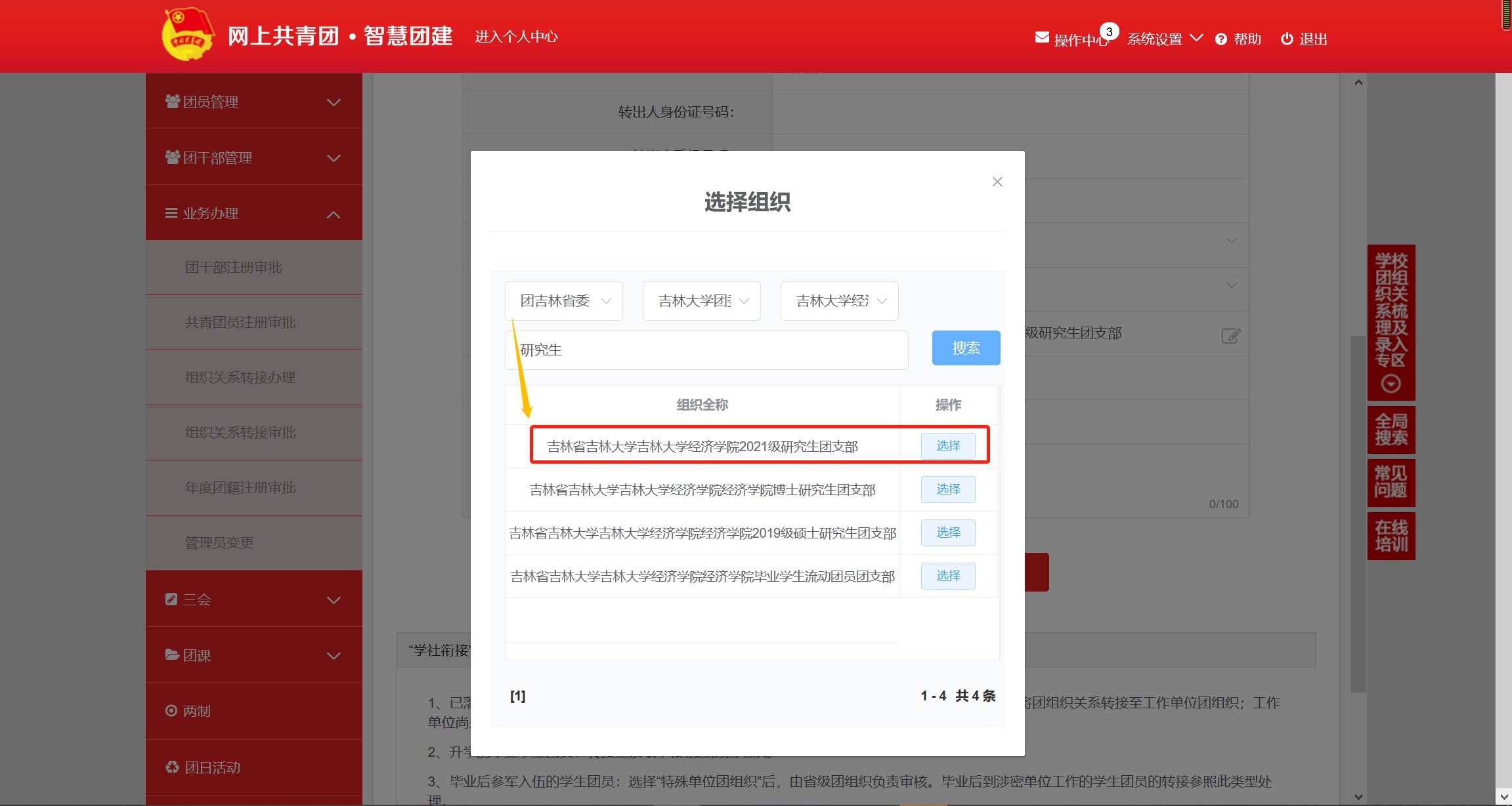 3.进入后,信息根据个人情况进行填写,其中注意【转入组织】一项,具体选择如下图所示: