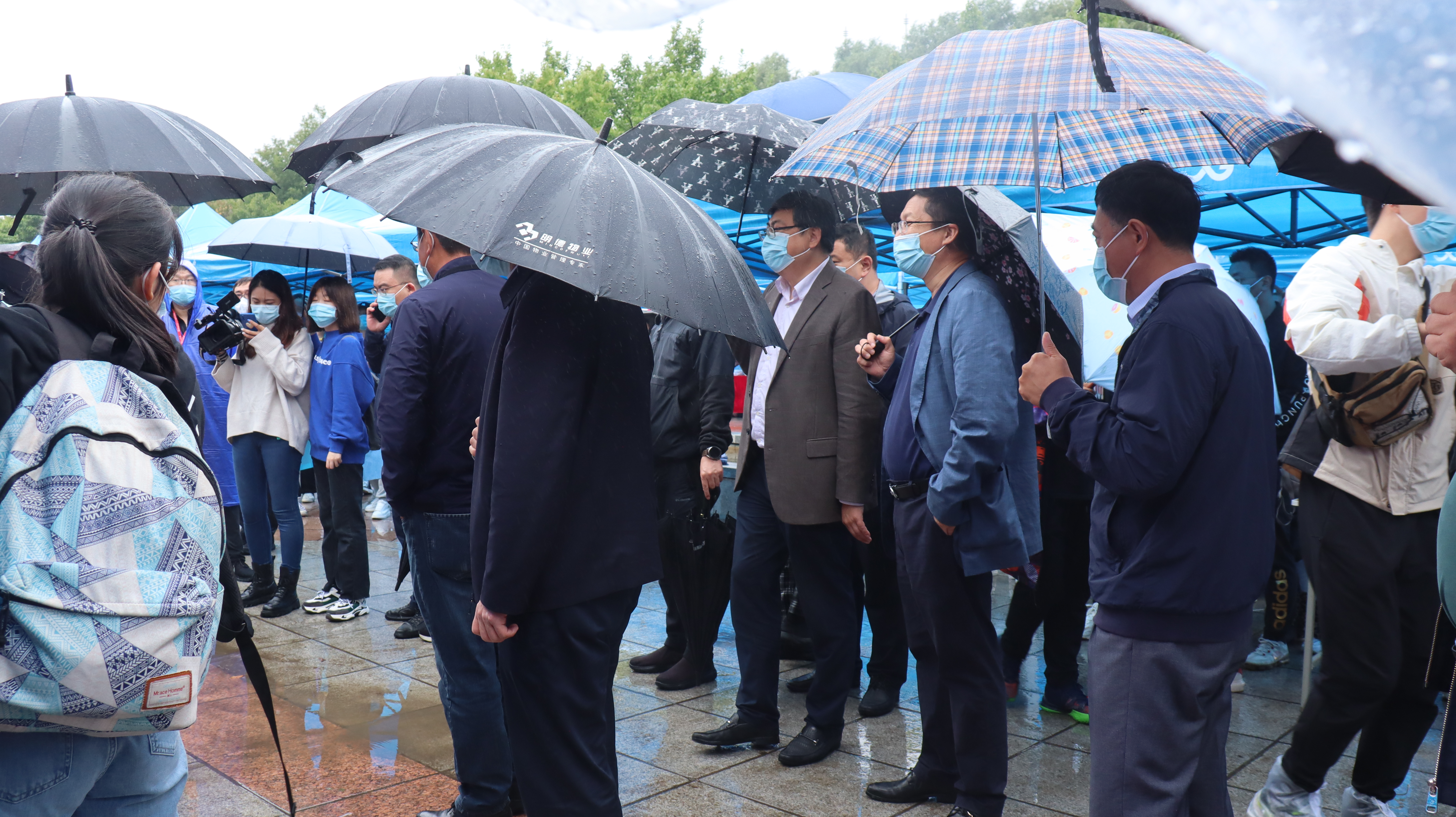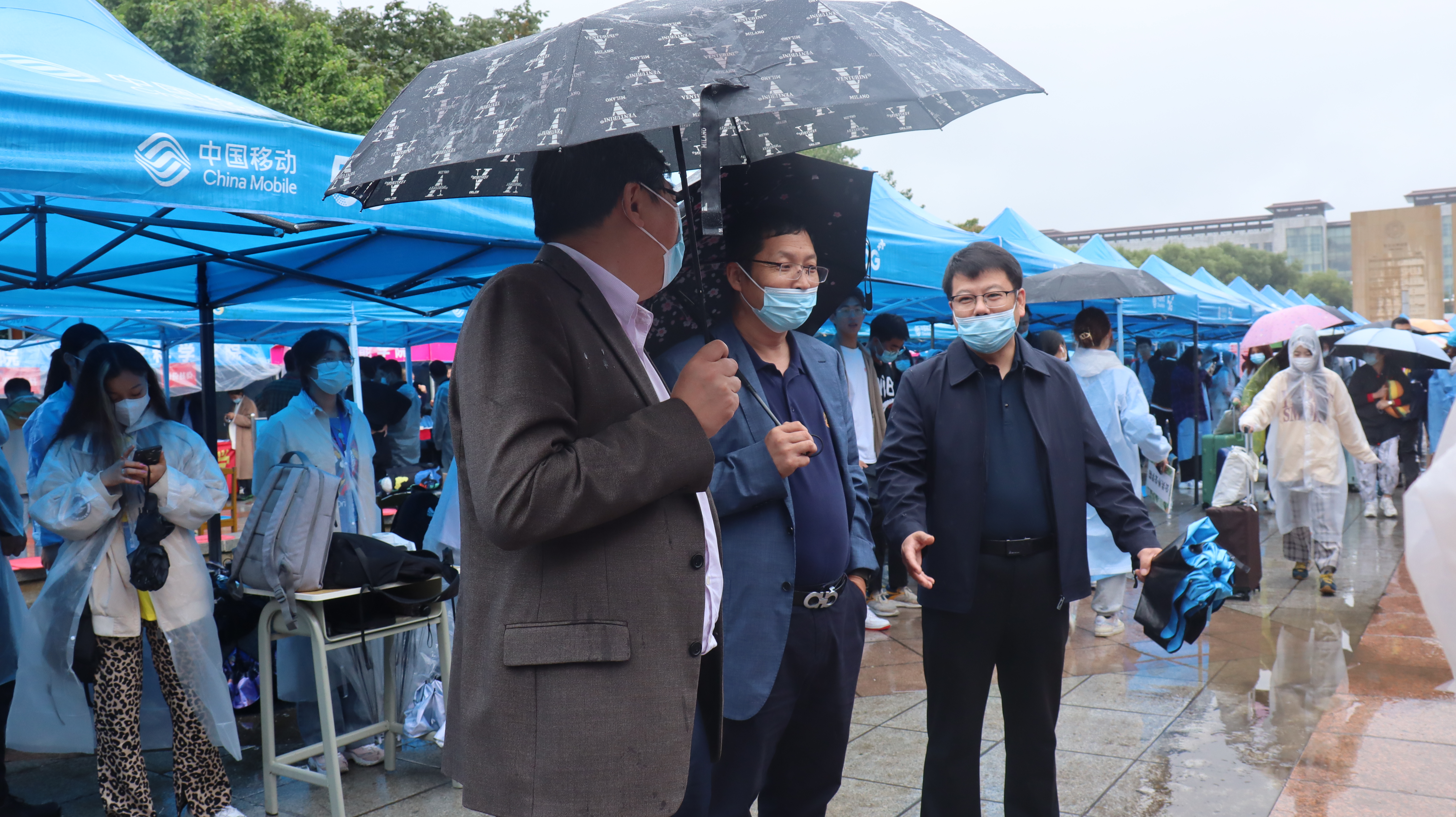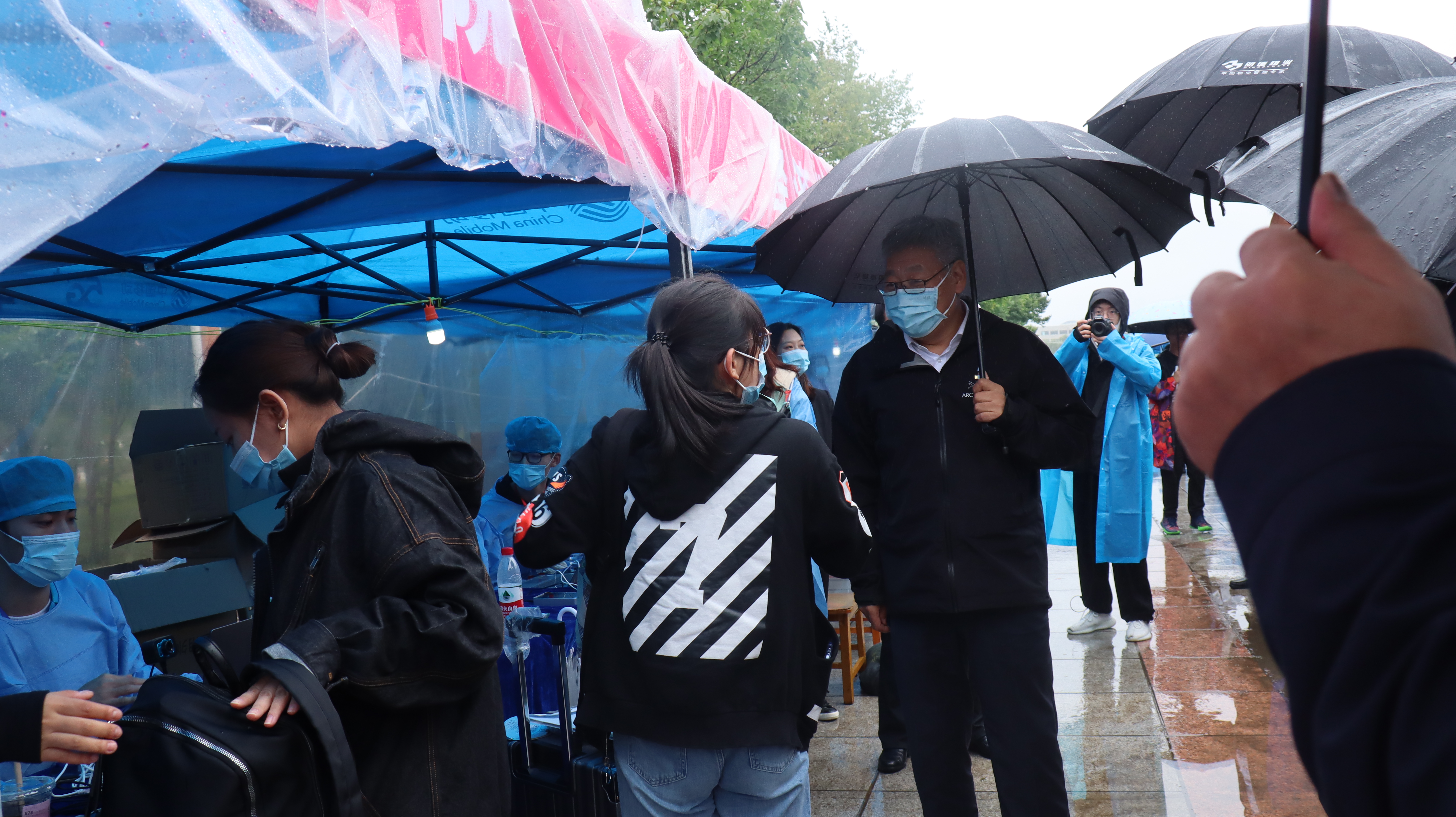 志愿者在辅导员老师的带领下,帮助新生顺利办理了报到手续。新生在志愿者的指引下陆续乘坐导站车离开报到现场,到达各自公寓。德赢vwin官方入口辅导员老师全程在现场进行相应的安排与指导,保证迎新工作的顺利、高效开展。下午三时许,德赢vwin官方入口党委书记聂宏凯、院长丁一兵、党委副书记赵勇来到五月花广场探望新生与工作人员,并给予新生入学相关的指引与帮助。随后,校党委常务副书记冯正玉、副校长王玉柱一行人来到德赢vwin官方入口迎新现场,对雨中参与迎新的全体师生表达了亲切的慰问。