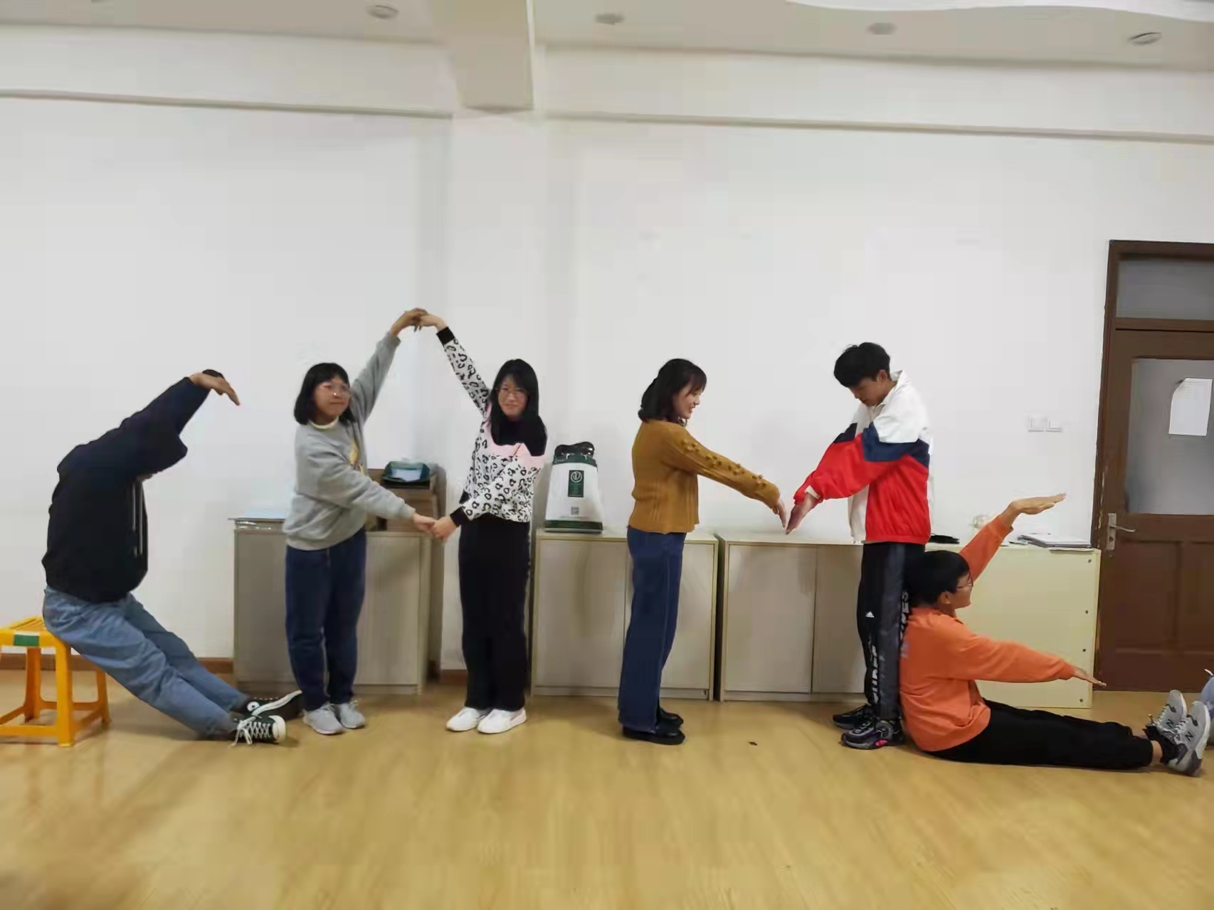 随后,紧张有趣的游戏环节开始!主持人组织了“信任之旅”的游戏。体验盲人的同学需要戴上眼罩,在引路人的指引下跨过同学们提前设置好的层层障碍。“盲人”们姿势千奇百怪,惹得大家开怀大笑。最终在引路人的指引下,“盲人们”都顺利通过了障碍,到达终点。而在下面的“集体登陆”游戏中,同学们更是集思广益,发挥各自的作用,作出必要的协商,最终成功地站在一张报纸上。最后的“人体字母”游戏更是把同学们之间的默契和配合能力展现的淋漓尽致!在各位同学的头脑风暴和完美配合下,该游戏最终顺利完成!