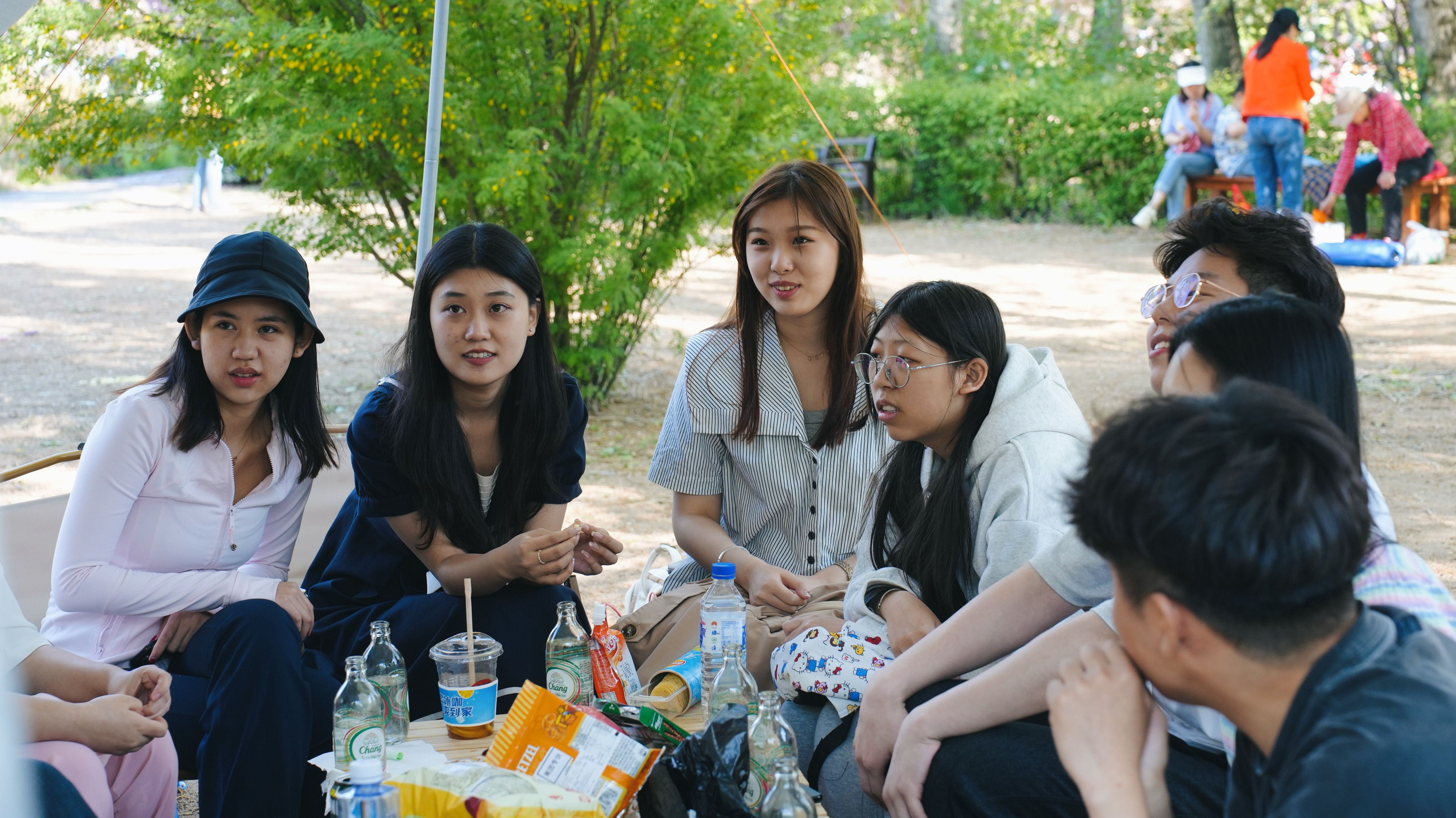 在森林氧气的自然风光下,在吉他演奏的音乐氛围中,同学们相互熟悉,敞开心扉。同学们一同动手搭建起了“多巴胺营地”,用“春日收集瓶”制作了自己的独家春日记忆,还以绘画的形式将心事写在情绪气球中,进行了放飞烦恼活动。最后大家共同绘制了“多巴胺心愿图”,用水彩和拼贴将自己的心愿表达,又将七彩的泡泡吹在画卷之上,随性地进行装点。在动手绘制中捋清思绪,在泡泡的纷飞中感受青春的美好与自由。