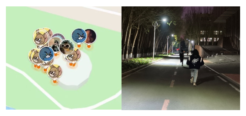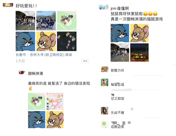 晚上六点,参与人员全部到场,在两班班委简单介绍游戏规则后,活动正式拉开帷幕。以微信群共享定位为基础,按同学意愿选出三只“猫”,其余二十余名成员则扮演“老鼠”,由“猫”去捕捉“老鼠”。游戏规则简单易懂,同学们热情满满,全身心投入到这场友谊的竞技中。