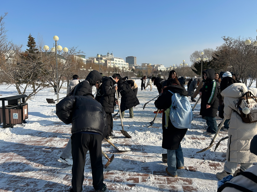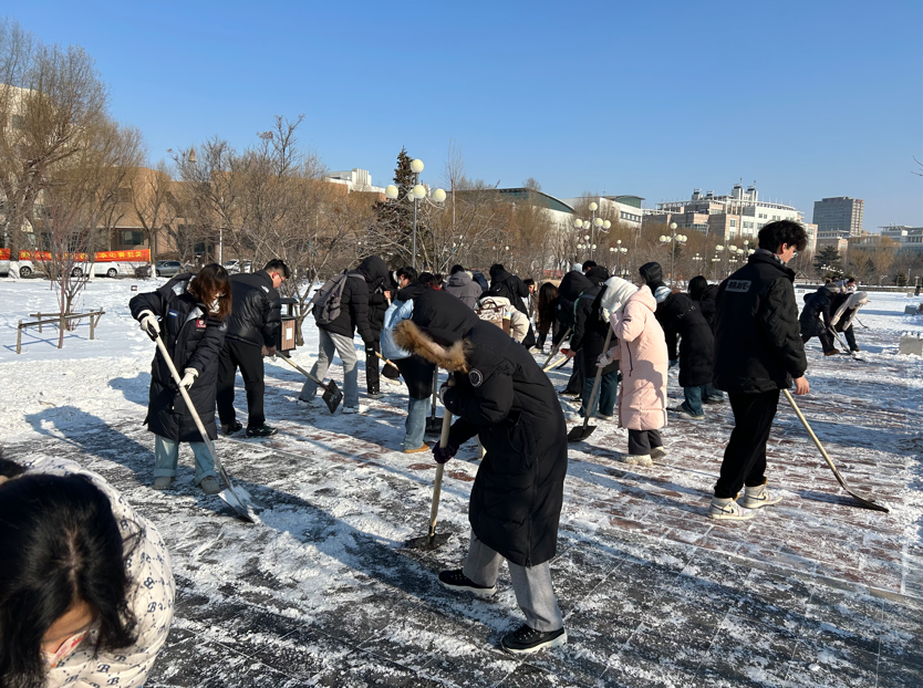 同学们首先在指定地点集合,领取了铲雪工具和清扫物资,随后按照事先规划的分组策略,有条不紊地开展了除雪工作。每位同学都专注于自己负责的区域,整个扫雪过程高效而迅速。尽管天气严寒,但大家毫无畏惧,齐心协力,迅速将主干道上的积雪铲除,确保了道路的畅通无阻。同时,同学们还细心地将冰层铲除,有效预防了师生行走时可能发生的滑倒等意外情况。在扫雪过程中,同学们彼此协作,展现了卓越的团队协作精神,用自己的实际行动诠释了团结一心,乐于奉献的高尚品质。