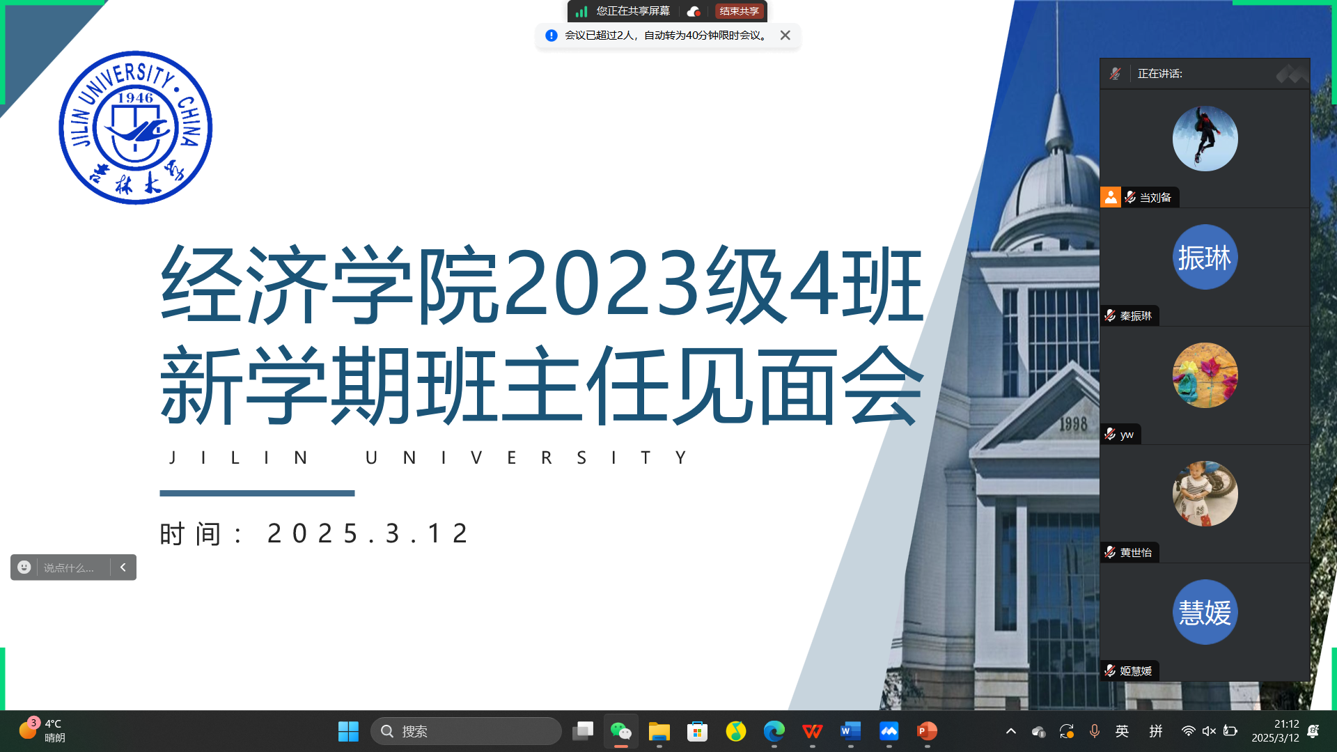 2024年3月12日晚,德赢vwin官方入口2023级4班线上召开“明晰方向,奔赴前程”的主题班会,4班全体同学参会。班主任潘长春主持召开此次会议,凭借深厚的专业素养与丰富的育人经验,为同学们悉心答疑、精准指明前行方向,为这一关键学期拉开序幕。