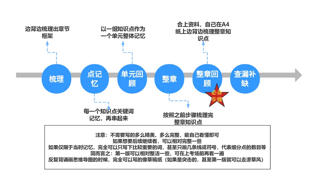 很多课程需要背诵记忆,这里我个人比较推荐的是思维导图记忆法。这个思维导图不必非常精美,只要个人能看懂即可。我个人实践出来比较高效的记忆过程是: