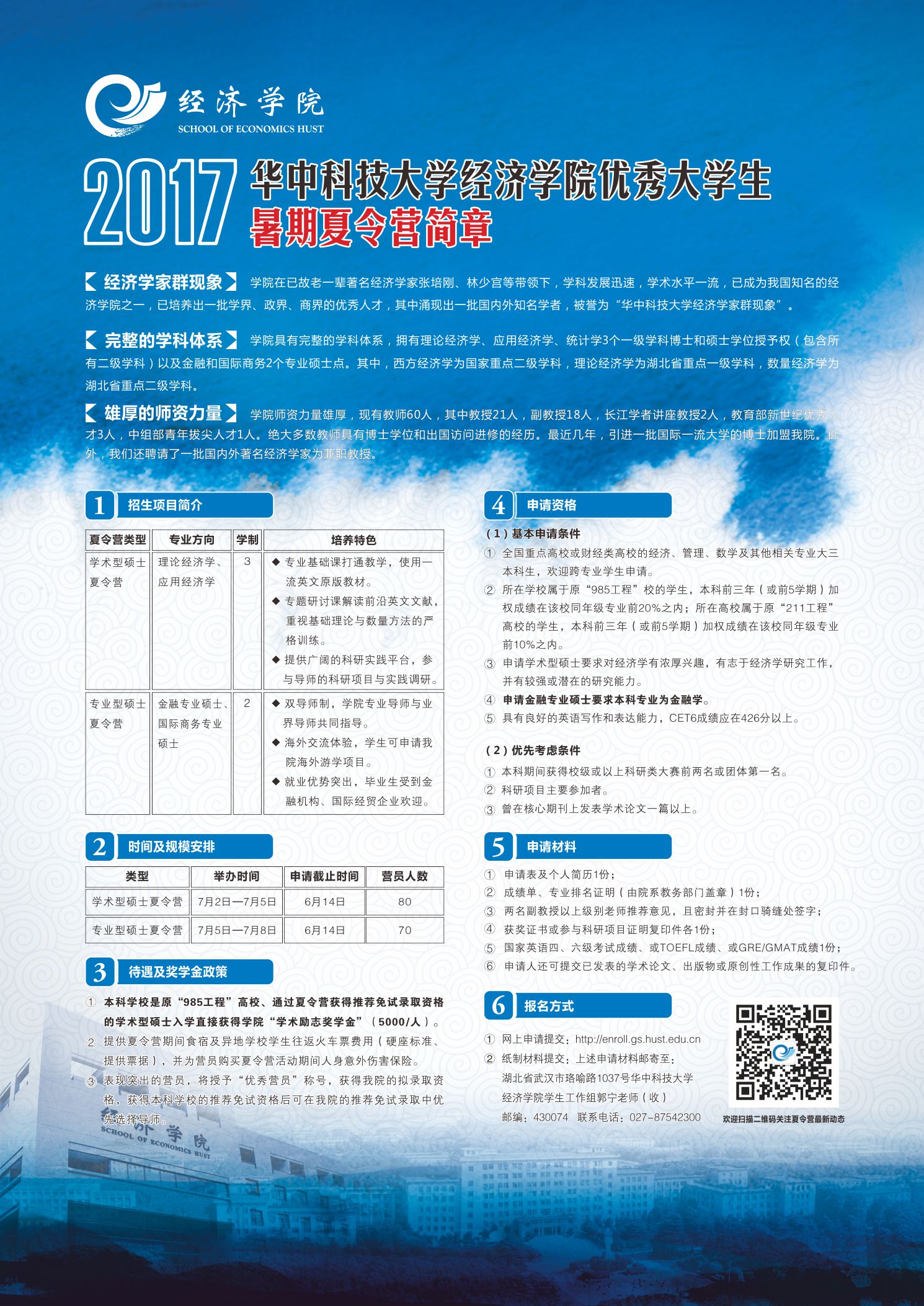 扫描二维码、搜索“hustjingji”关注夏令营最新动态