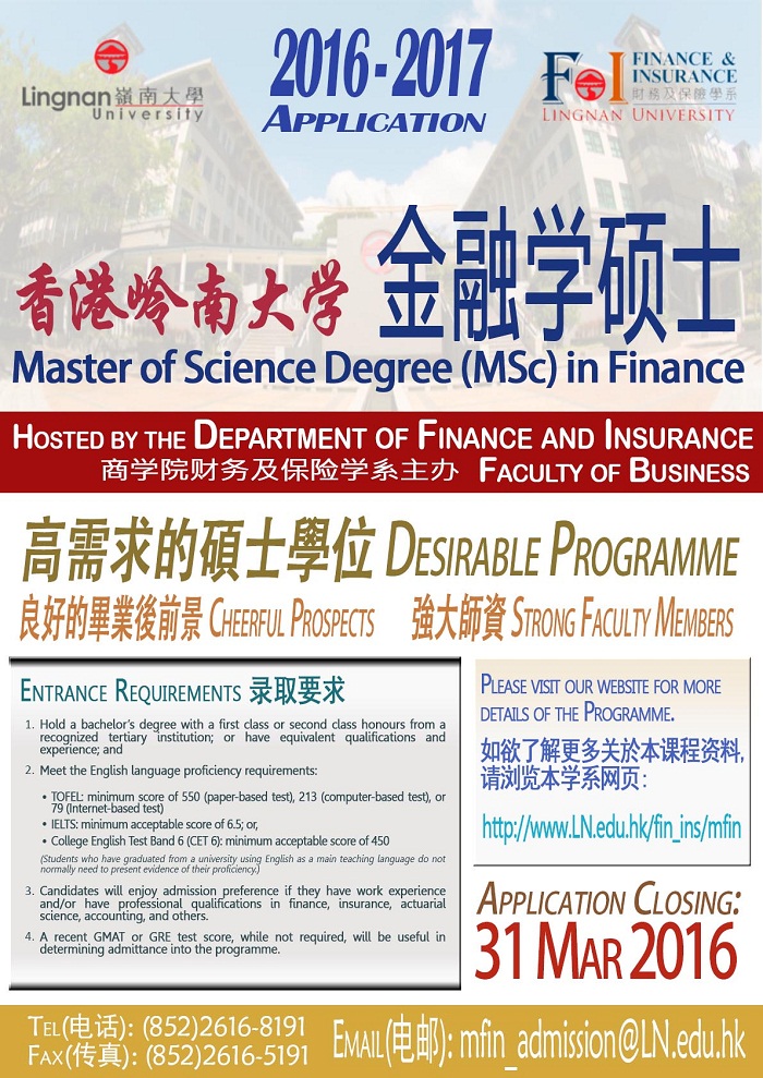 香港岭南大学商学院授课式研究生项目,金融、电子商务,人力资源管理和会计专业。2016年夏季入学,学制一年。附件中有招生简章供参考http://www.ln.edu.hk/fb or www.LN.edu.hk/fin_ins/mfin