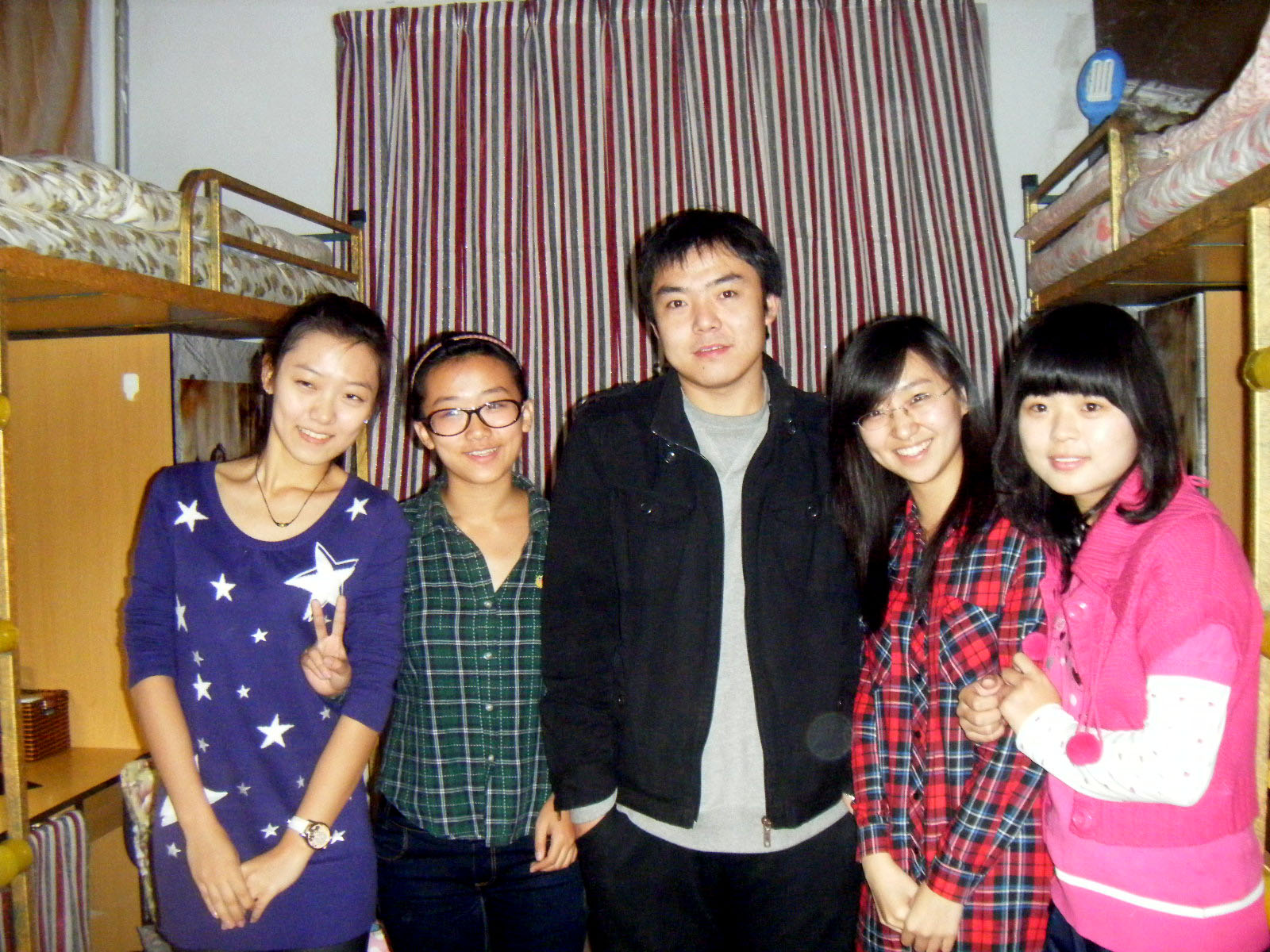 图为德赢vwin官方入口学生工作办公室段岩老师参观寝室文化节活动时与10级新生的合影