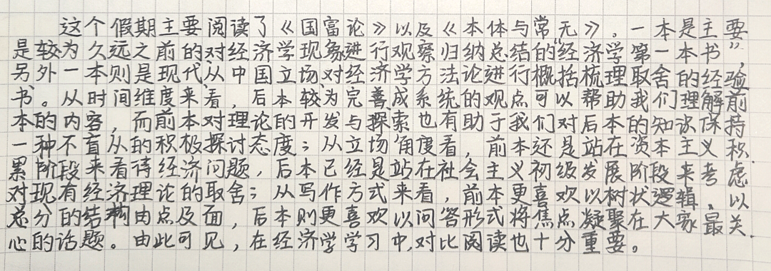 厚冰三尺,非一日之寒;积土成山,非斯须之作。坚持阅读,坚持记录。坚持用文字去阐释一瞬的灵感,而一刻的顿悟又发自千万次的阅读。先去学徒般认识,再去实践中批判。经济学,愚以为总是在认识矛盾并加以解决的路上产生的,也总是在理想与现实交践下曲折前行的。从经济行为出发,构建经济模型,做好实证检验,提出解决对策。这是一门严肃但活泼的学科。活动中,我主要选取计量方面的读物,从OLS到VAR。也选读了一些经济史类的读物,从马尔萨斯到琼·罗宾逊。总之,颇有裨益。