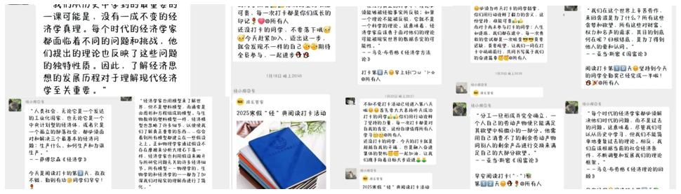 打卡活动期间,为了进一步增强活动的互动性和实效性,调动同学们的积极主动性,勤劳的经小探们每日清晨都会按时在打卡群内发送每日经典语录,勉励督促同学们以“经”典启智、凭阅读“济”深,进一步激发了大家对经济学的热爱和探索欲。