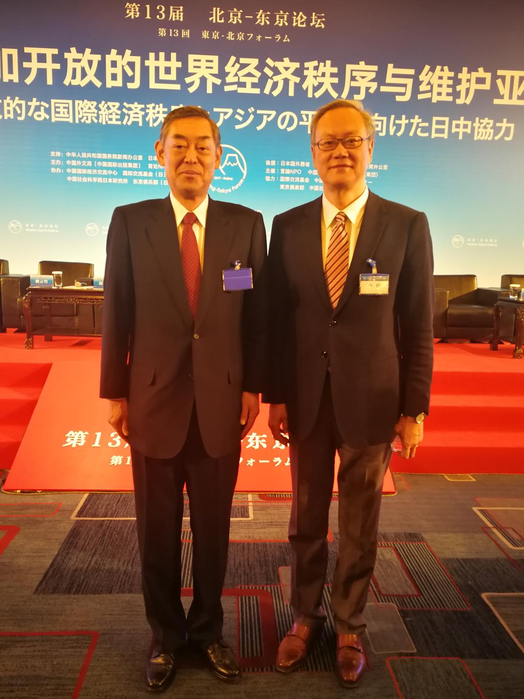 2017年12月15至16日,由中华人民共和国国务院新闻办公室和日本外务省作为支持单位、由中共外文局和日本言论NPO主办的第十三届北京——东京论坛在北京举行。本届论坛的主题是“中日共建更加开放的世界经济秩序与维护亚洲和平”。中共中央宣传部副部长、国务院新闻办公室主任蒋建国、中国外文局局长张福海、中国人民大学新闻学院院长、国务院新闻办公室原主任赵启正、中国国际交流中心副理事长、商务部原副部长魏建国、日本前首相福田康夫、联合国原副秘书长明石康、日本众议院议员、前防务大臣中谷元、众议院议员、前外务大臣松本刚明、日本前驻华大使宫本雄二和现任大使横井裕以及日本银行前副总裁山口广秀等中日双方共计200余为官员、专家和学者参加了本届论坛。