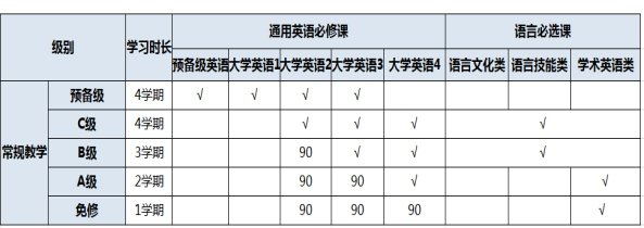 每个等级的学生按照以下图表中“√”规定的范围选课、修满对应学分。被分入免修级、A级、B级的学生,默认获得低于其级别的学分,并按90分计入其成绩单(详见图表)。